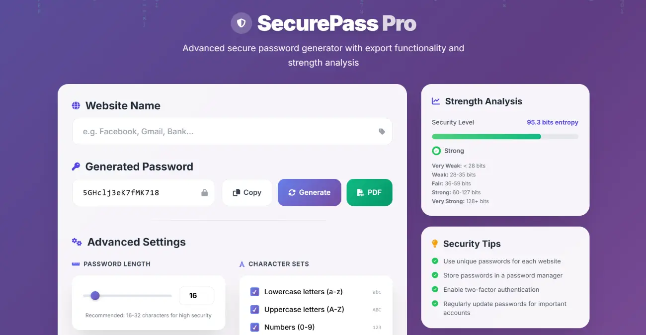 Wielu użytkowników wciąż używa prostych i powtarzalnych haseł, co stanowi ogromne ryzyko bezpieczeństwa. SecurePass Pro pozwala w pełni spersonalizować proces tworzenia haseł i natychmiast sprawdzić ich siłę. Dzięki funkcji eksportu do PDF łatwo przechowasz hasło w bezpiecznym miejscu.